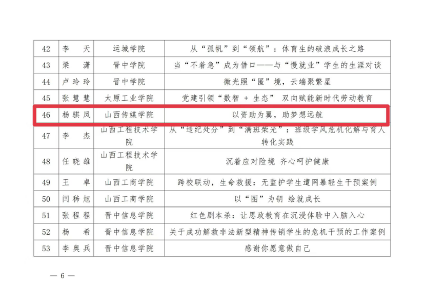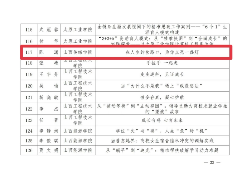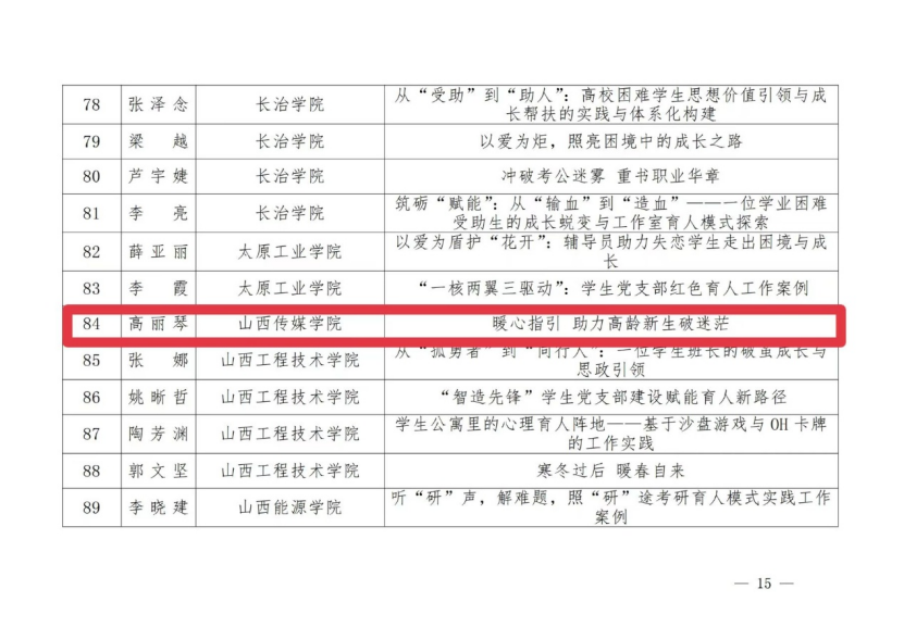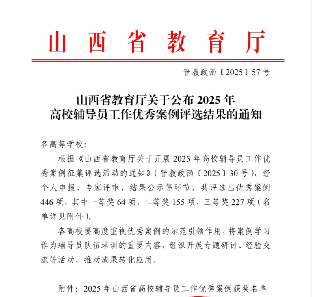 近日,山西省教育厅公布2025年高校辅导员工作优秀案例征集评选结果。我校3名辅导员的工作案例成功入选。其中,杨骐凤老师荣获一等奖;高丽琴老师荣获二等奖;陈潇老师荣获三等奖。