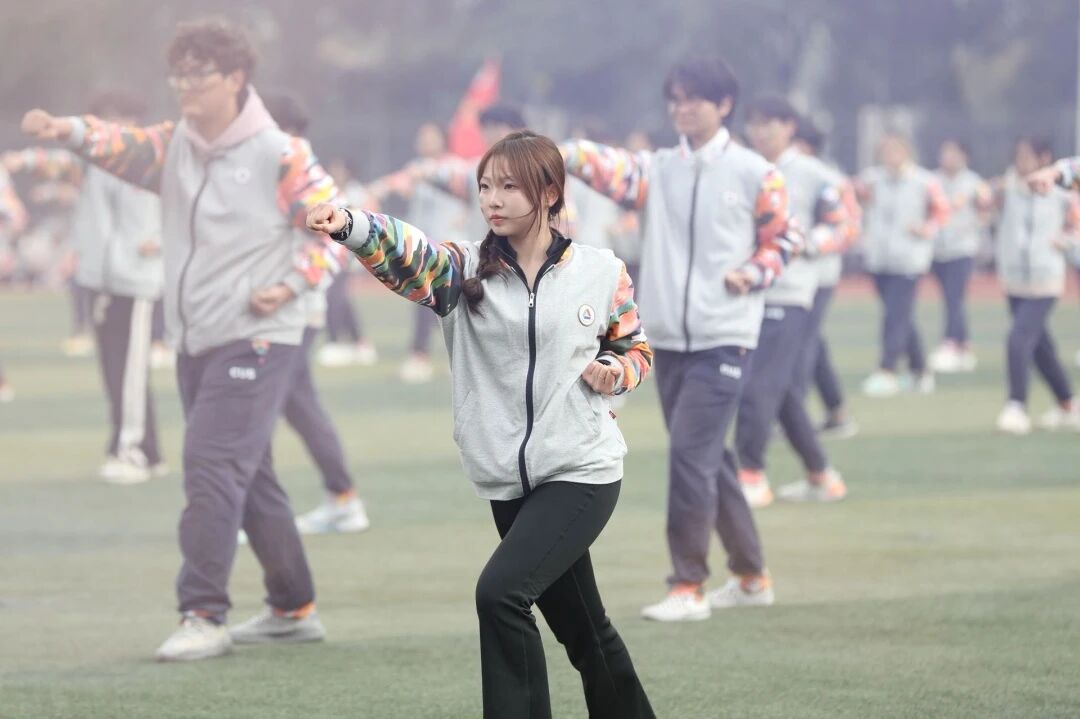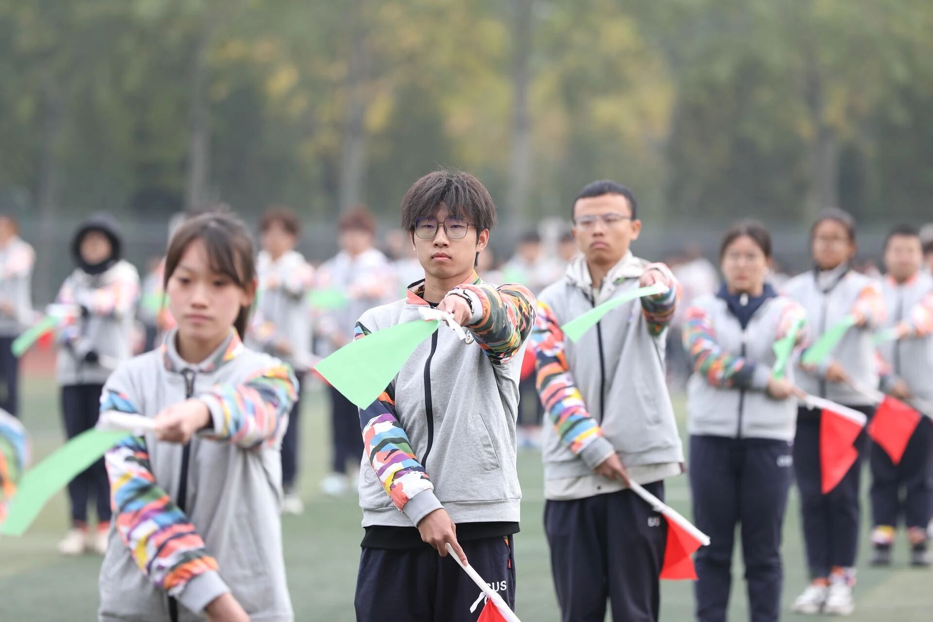 旗羽方队手持红绿旗帜,动作整齐划一,在力与美的交响中尽显青春风采。