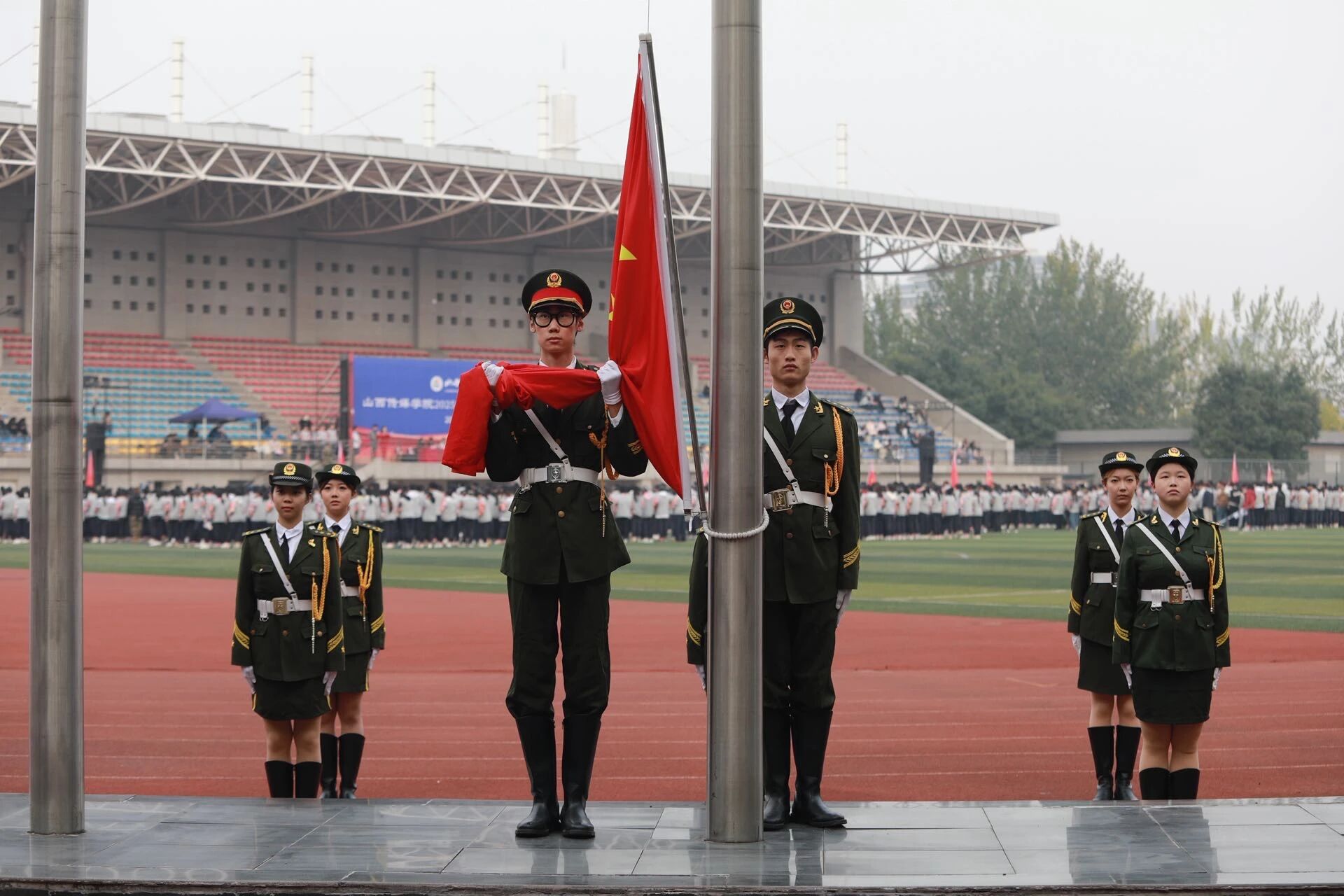 庄严的国歌声在空气中回荡,五星红旗冉冉升起。那抹耀眼的红色,是国家的象征、民族的骄傲,更在微凉的空气中,激励着每一位新同学以爱国为底色,书写未来的精彩人生。