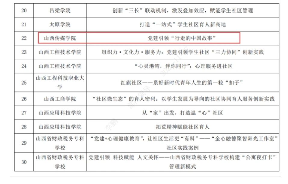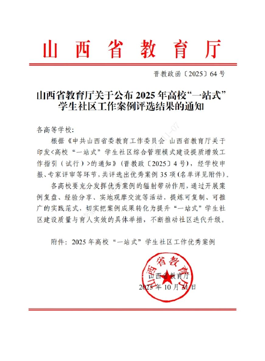 近日,山西省教育厅公布了2025年高校“一站式”学生社区(以下简称“一站式”)优秀案例评选结果,我校报送的《党建引领“行走的中国故事” 》工作案例从百所高校中脱颖而出,成功入选省级优秀工作案例。
